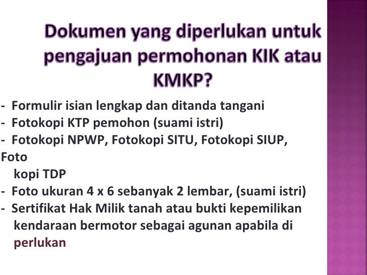 Untuk mendapatkan Kredit Investasi Kecil KIK dan Kredit Modal Kerja permanen KMKP ini kita perlu datang ke kantor cabang bank terdekat dan mengisi formulir yang telah disediakan serta membawa persyaratan dokumen yang diperlukan beserta fotokopinya. Syarat yang harus dipenuhi untuk mendapatkan kredit ini adalah. KIK termasuk kredit investasi tetapi jumlahnya relative kecil sedangkan KMKP adalah kredit produksi atau eksploitasi.