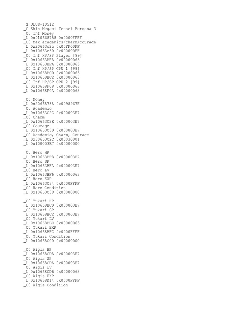Cwcheat Shin Megami Tensei. Persona 3 Portable US _C0 Academic Charm Courage _L 0x80663C2C 0x00030001 _L 0x100003E7 0x00000000 _C0 Aigis 999. Credits - Skiller PS2 version Japanese Hackers PS2PSP.