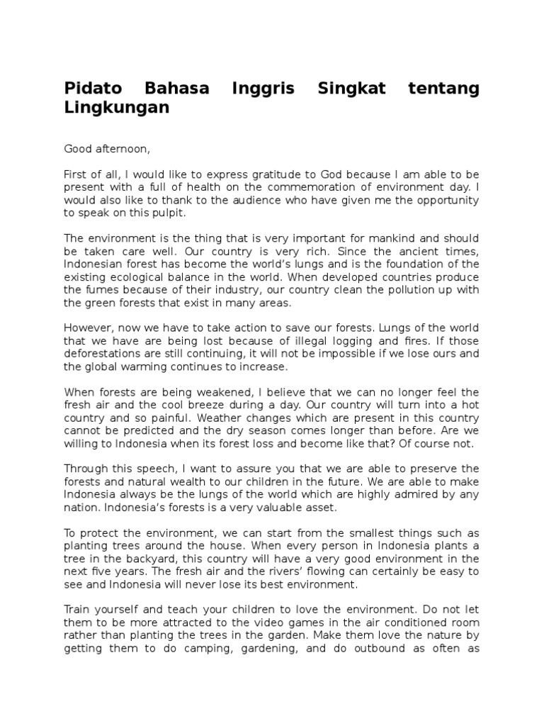 Contoh Pidato Bahasa Inggris Singkat Tentang Lingkungan Dan Artinya