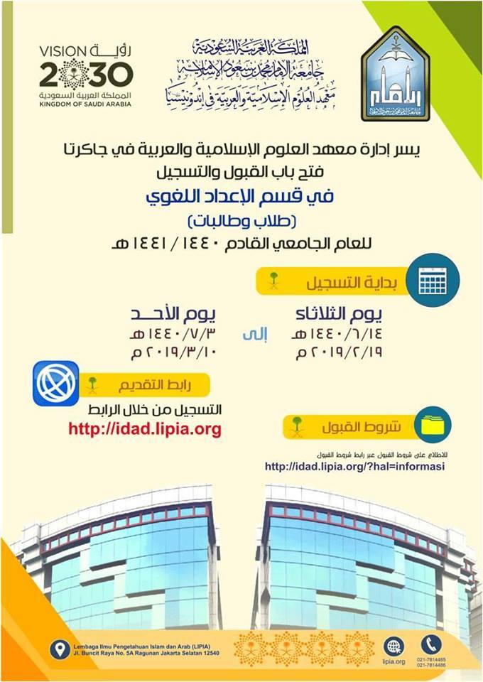 Pendaftaran Belajar Bahasa Arab Online 2019 PENDAFTARAN MAHASISWA BARU QISM IDAD LUGHOWI DAN TAKMILI LIPIA JAKARTA Tahun. Pendaftaran kuliah gratis plus uang saku di LIPIA Jakarta sudah dibuka bulan ini Maret 2020 M. Selasa-Rabu 24-25 Dzulhijjah3-4 Oktober 2018 Registerasi online.