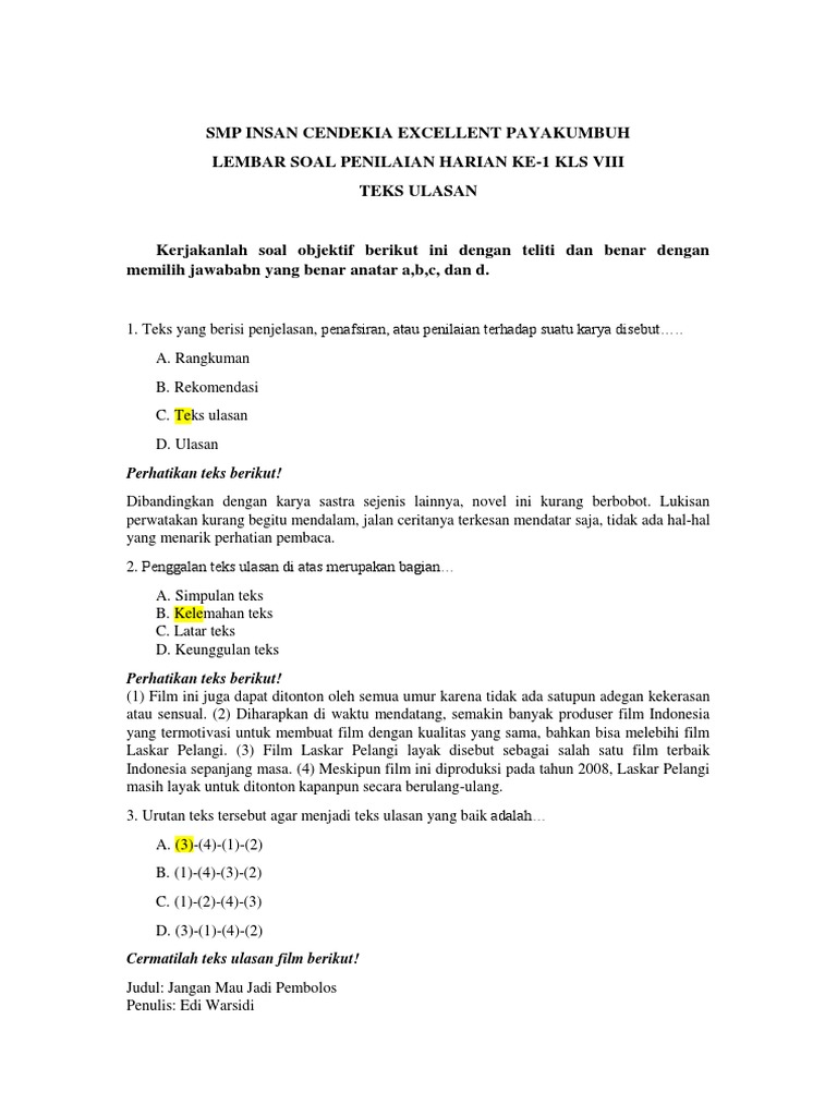 Karena teks ulasan diatas berisi tentang pandangan dari pengulas mengenai hasil karya yang diulas kelebihan dan kekurangan karya yang diulas Teks ulasan adalah suatu teks yang berisi ulasan penilaian atau review terhadap suatu karya. Berikut Contoh Soal Latihan Online PAT UKK UAS Bahasa Indonesia Kelas VIII 8 SMP tahun 2021 Tahun Pelajaran 20202021. Kalimat berikut yang merupakan bagian dari teks ulasan yang mengulas novel adalah.