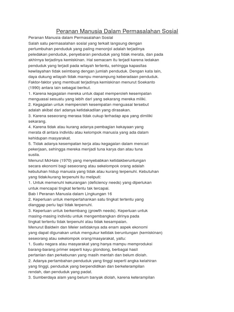 Peranan manusia dalam permasalahan sosial. Permasalahan sosial adalah keadaan yang. Artinya bahwa setiap manusia itu mempunyai hak kewajiban dan berkesempatan yang sama dalam menguasai sesuatu seperti. Dari ketiga watak mahasiswa diatas kalau dikaji dengan filsafat manusia merupakan hewan yang berfikir maka mahasiswa golongan di atas yang selalu berinsting yang berorientasi akan pemenuhan kebutuhan pribadi maka dia adalah termasuk dalam kategori binatang karena tidak menggunakan otaknya untuk berfikir buat orang lain sebagai hakikatnya manusia sebagai mahluk sosial.