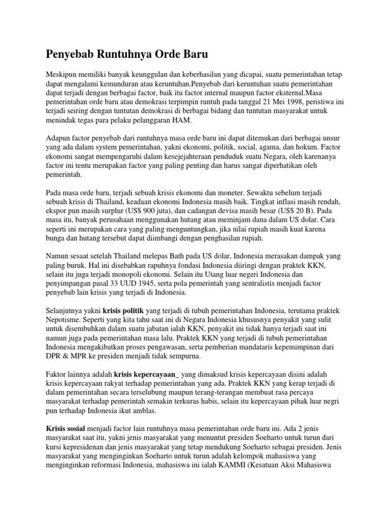 Ini disebabkan banyaknya sebuah masalah kompleks yang muncul di kalangan masyarakat. Penyebab runtuhnya orde baru adalah krisis moneter tahun 1997 Gerakan Mahasiswa tahun 1998 krisis politik faktor sosial. Runtuhnya Orde Baru Orde baru yakni sangat identik dalam sebuah nama Soeharto merupakan salah satu seorang presiden di negara Indonesia dengan pemerintahan lama dengan antara 1966 hingga 1998.